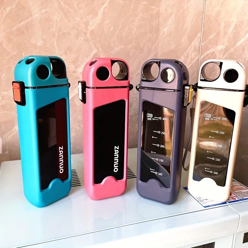 1 pcs Drinkware Plastic Double Layer With Lock Spring Cap, Straw Cup, Flat With Scale, Outdoor Sports Kettle, Water Bottle