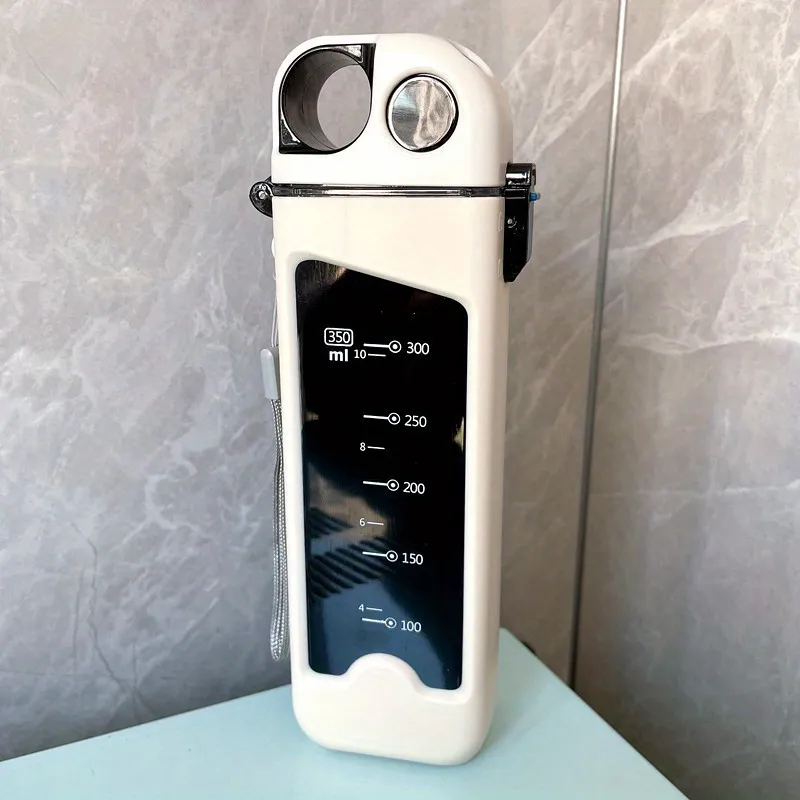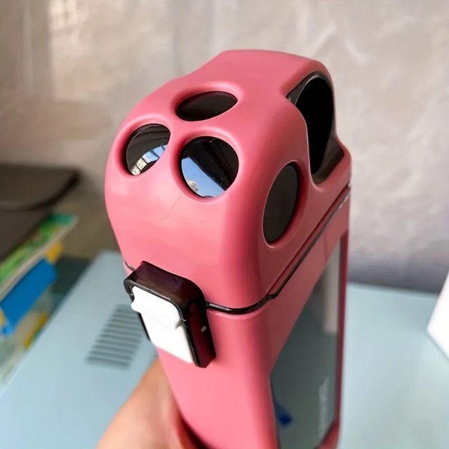 This plastic double-layer drinkware with a lock spring cap and straw is perfect for outdoor sports and activities. The flat design with scale makes it easy to carry and measure your water intake. The bottle comes in a stylish pink, white, and blue color scheme. Its durable construction ensures that it can withstand the rigors of outdoor use. Stay hydrated on the go with this convenient and practical water bottle.