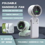 The fan is foldable, allowing it to be used as a handheld or a desk fan.